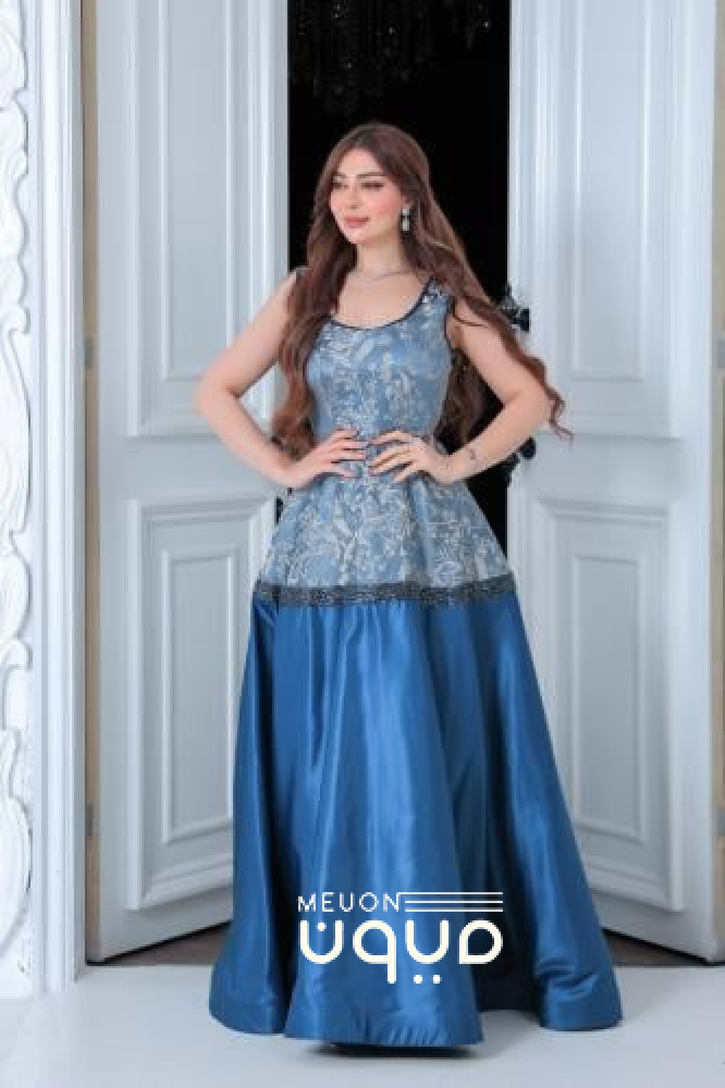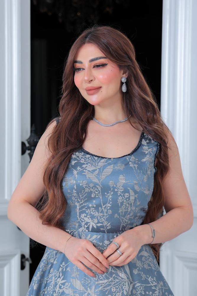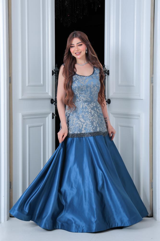 فستان أزرق ملكي ، صُمم ليمنحك حضور مميز في كل مناسبة. الجزء العلوي مصنوع من قماش الجاكار الفاخر بتصميم مزخرف راقٍ، أما الجزء السفلي فيأتي من قماش الساتان اللامع بقصة واسعة وانسيابية تزيد من جاذبية الإطلالة. تفاصيل ناعمة على الخصر تضيف لمسة فخمة تجعل الفستان مثاليًا للسهرات والمناسبات الراقية.