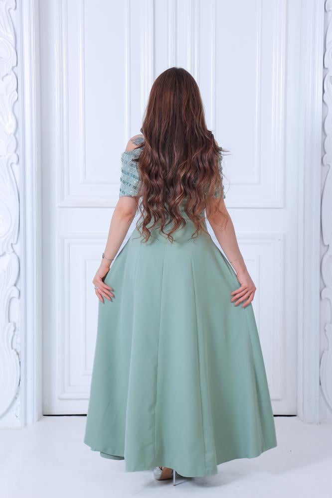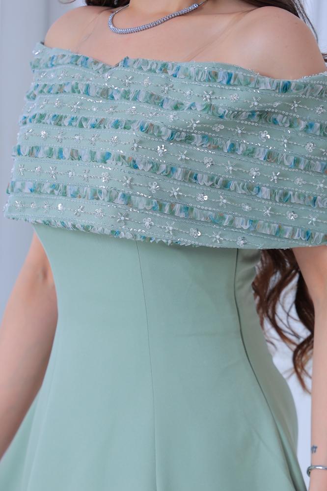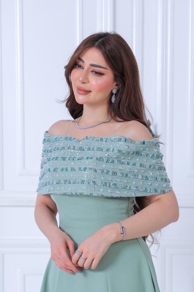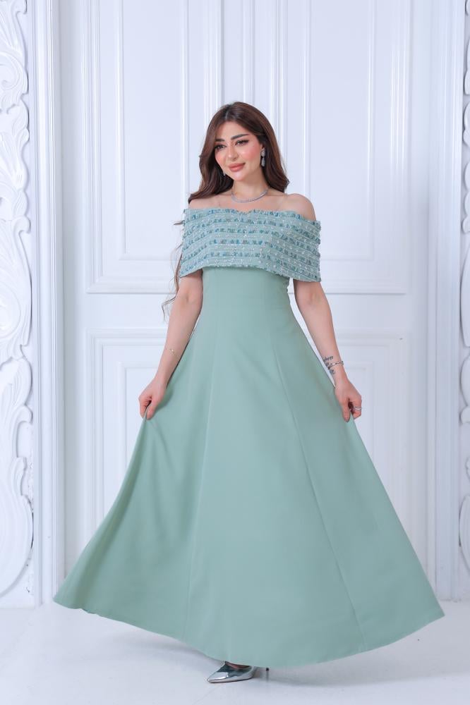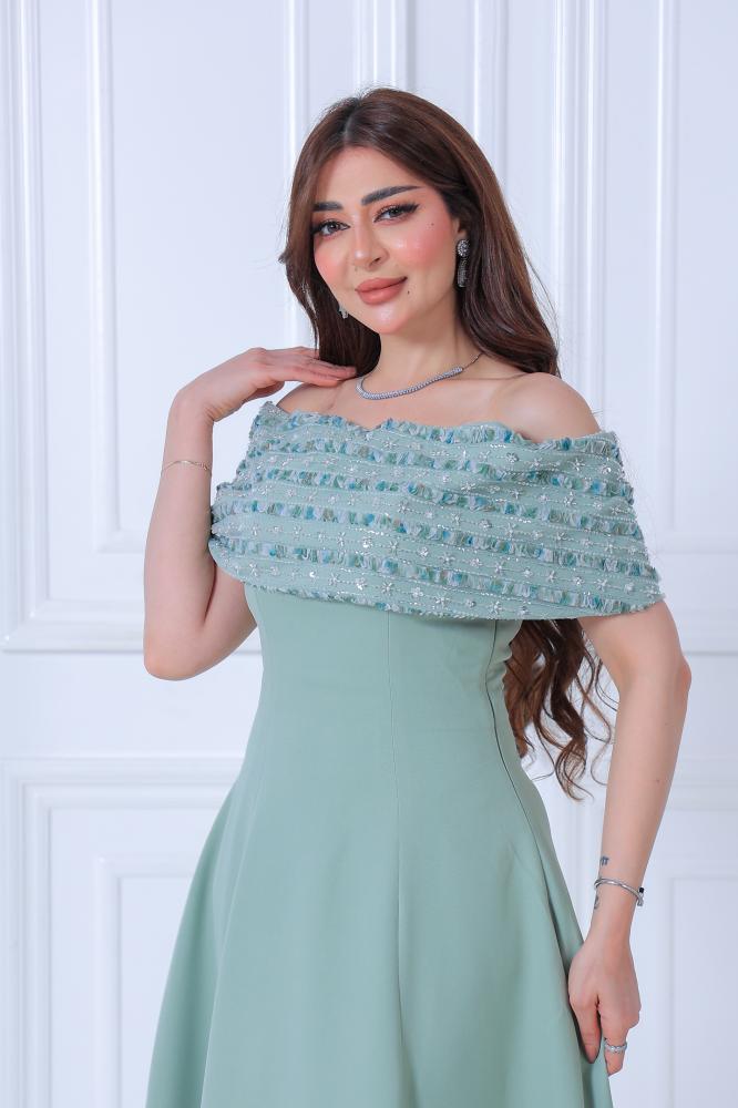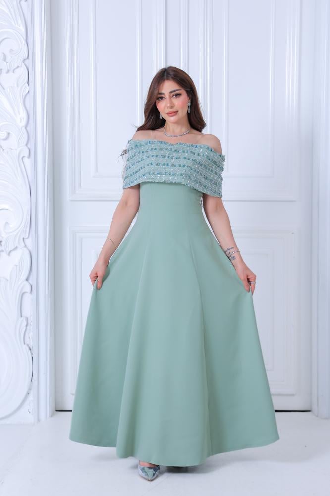 فستان اخضر فاتح باستيل ناعم، مصنوع من قماش الباربي الفاخر المعروف بملمسه الانسيابي ومظهره الناعم. يتميز بقصة A-line واسعة وانسيابية تمنح إطلالة راقية. الجزء العلوي بتصميم أوف شولدر مزين بطبقات مطرزة بخيوط لامعة تضيف لمسة فخمة على الأكتاف والصدر. فستان يجمع بين البساطة والرقي، مثالي للمناسبات الراقية والسهرات الهادئة.