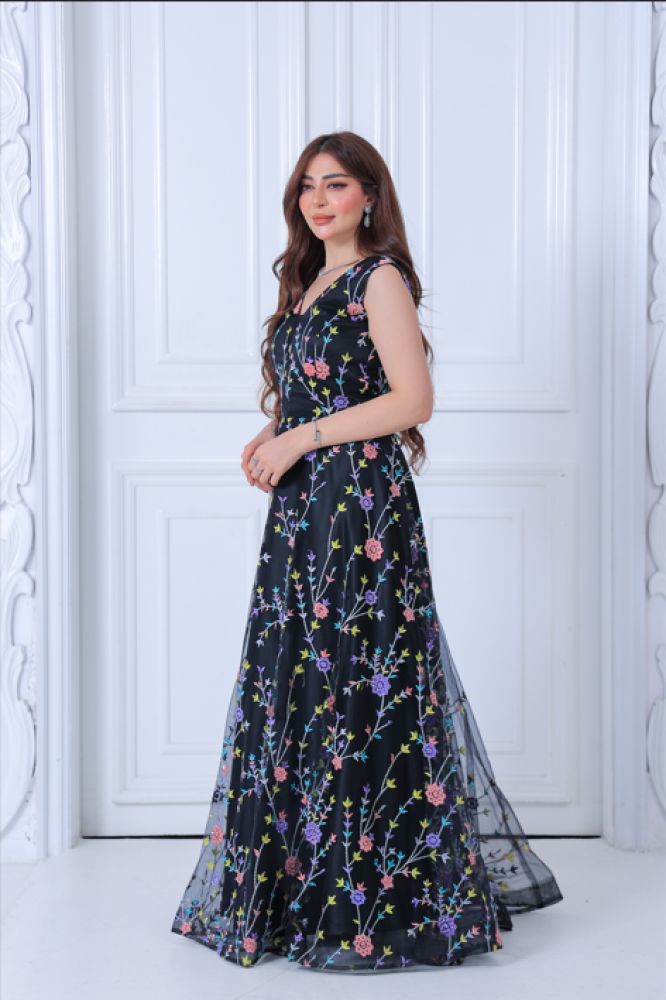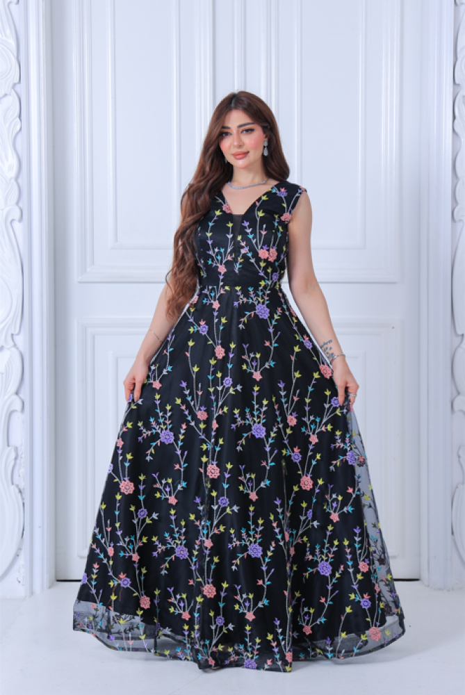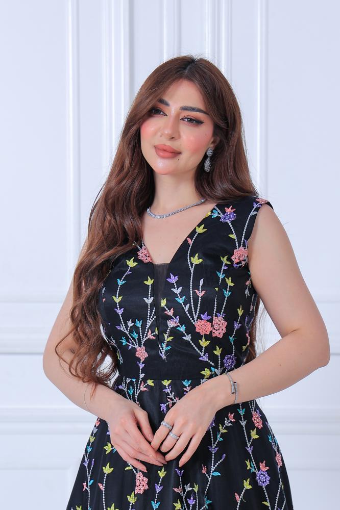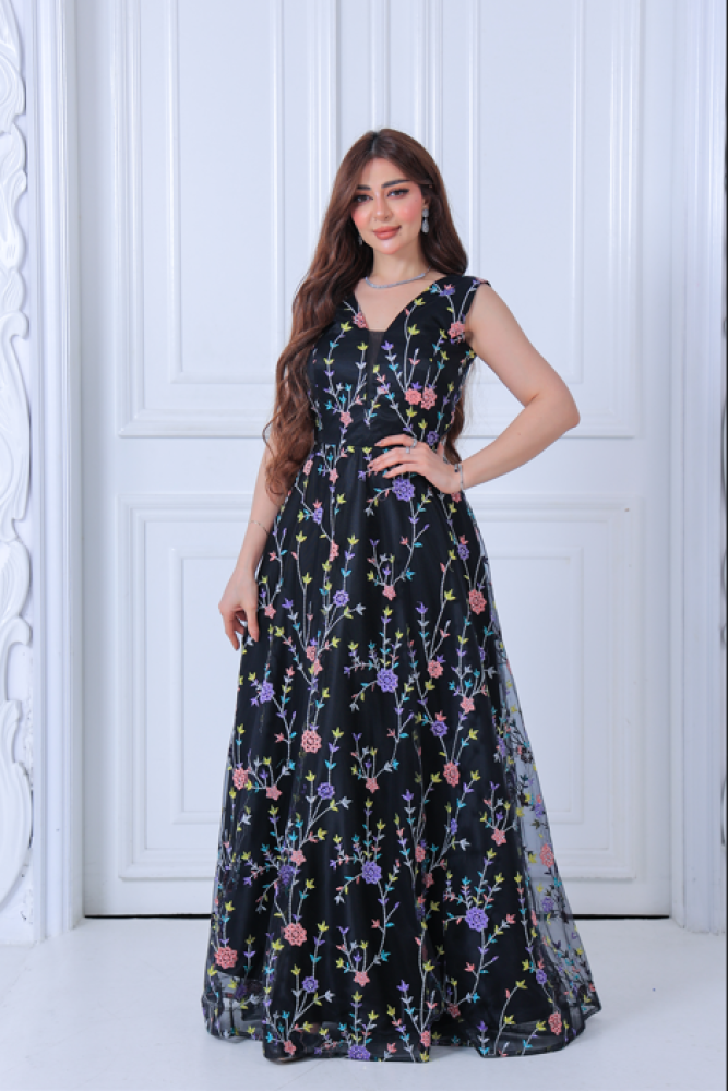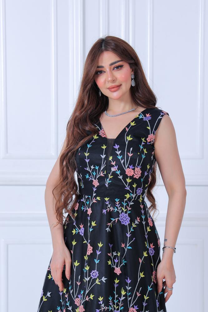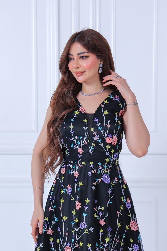 فستان اسود مشجر أنيق، مصنوع من قماش التل المطرز بالكامل بتطريز يدوي ملون على شكل أزهار وأغصان، مما يمنحه طابعاً ربيعياً أنثوياً ناعماً. يتميز بقصة واسعة بقماش منسدل، مع ياقة V بدون أكمام تبرز جمال الرقبة والأكتاف. فستان يجمع بين الأناقة والنعومة، مثالي للمناسبات الراقية والحفلات.