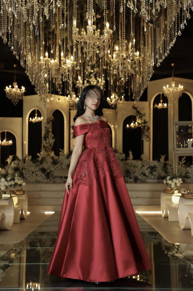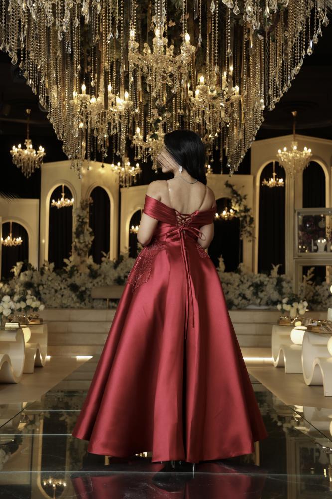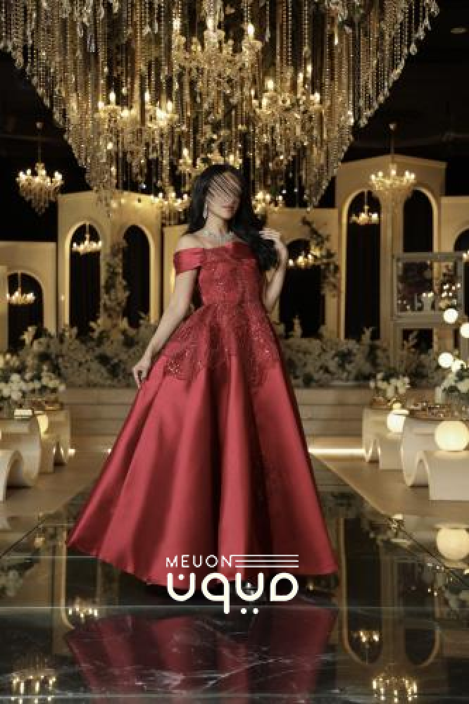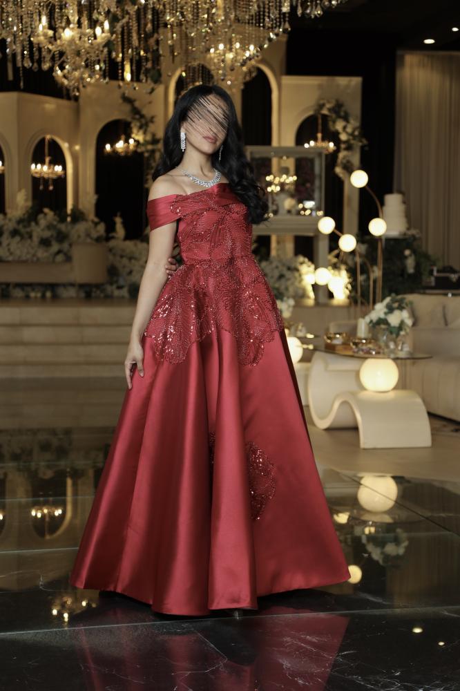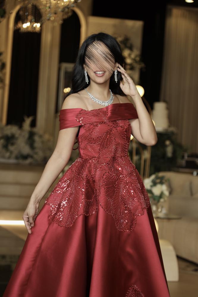 فستان سهرة فاخر بلون أحمر بوردو، مصنوع من قماش الميكادو الفخم مع تطريزات لامعة تضفي لمسة من البريق. بتصميم أوف شولدر وقصّة واسعة أنيقة، يمنحك إطلالة ملكية مثالية للمناسبات الراقية.