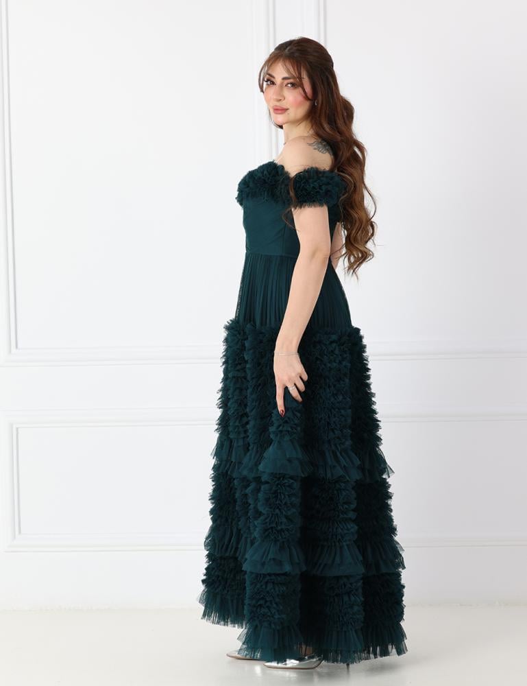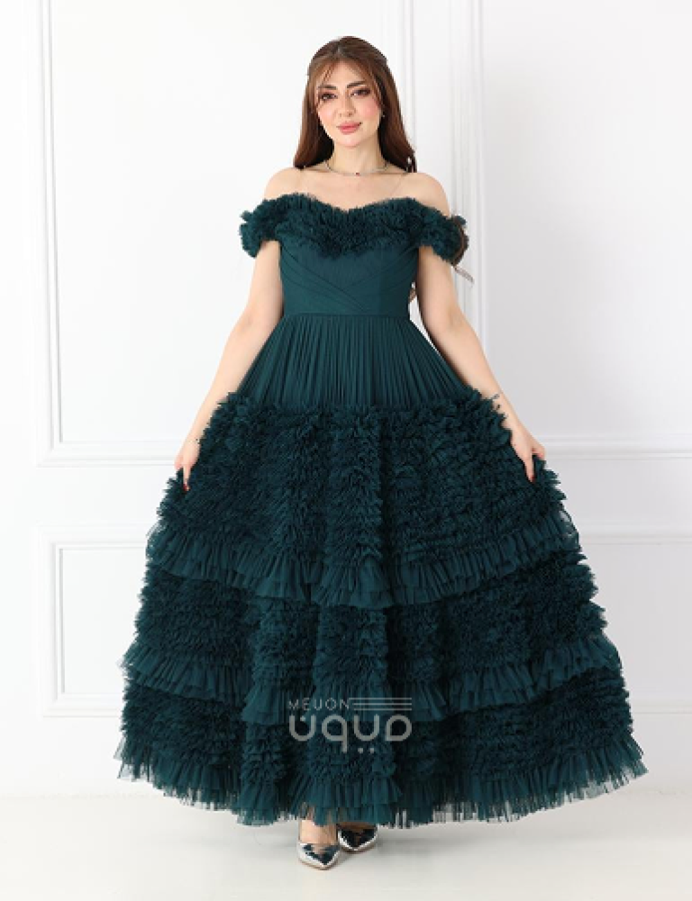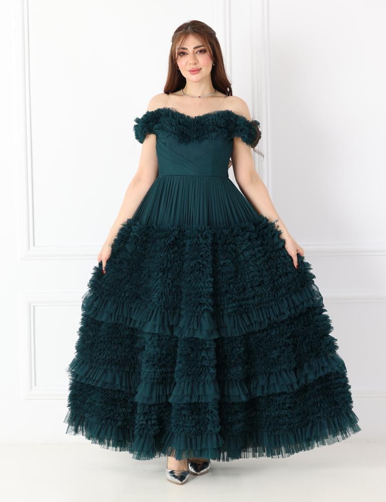 فستان تل بتصميم أنثوي يبرز جمالك بكل نعومة. مثالي للحفلات ناعم بطبقات خفيفة، يعكس النعومة والرقي بكل تفصيلة ، تناسب حفلاتك بكل الأوقات .