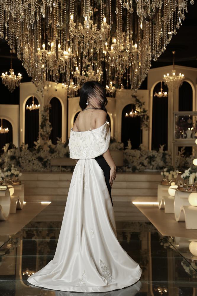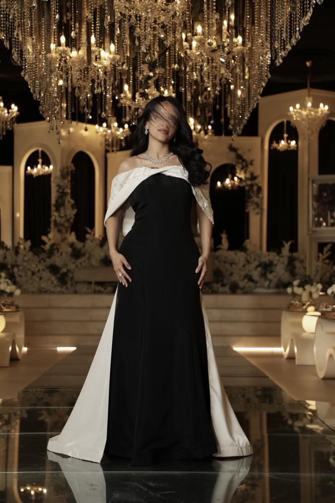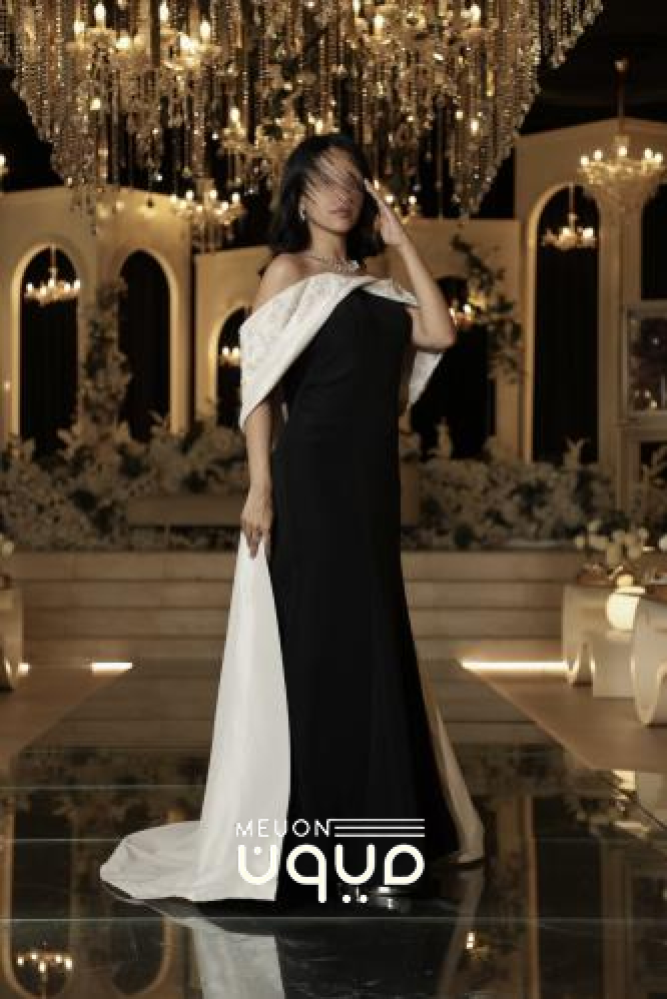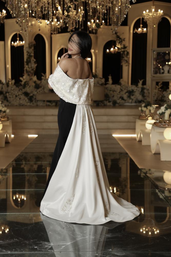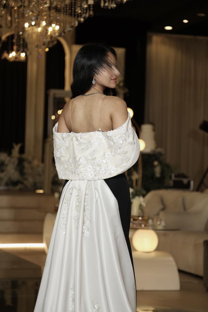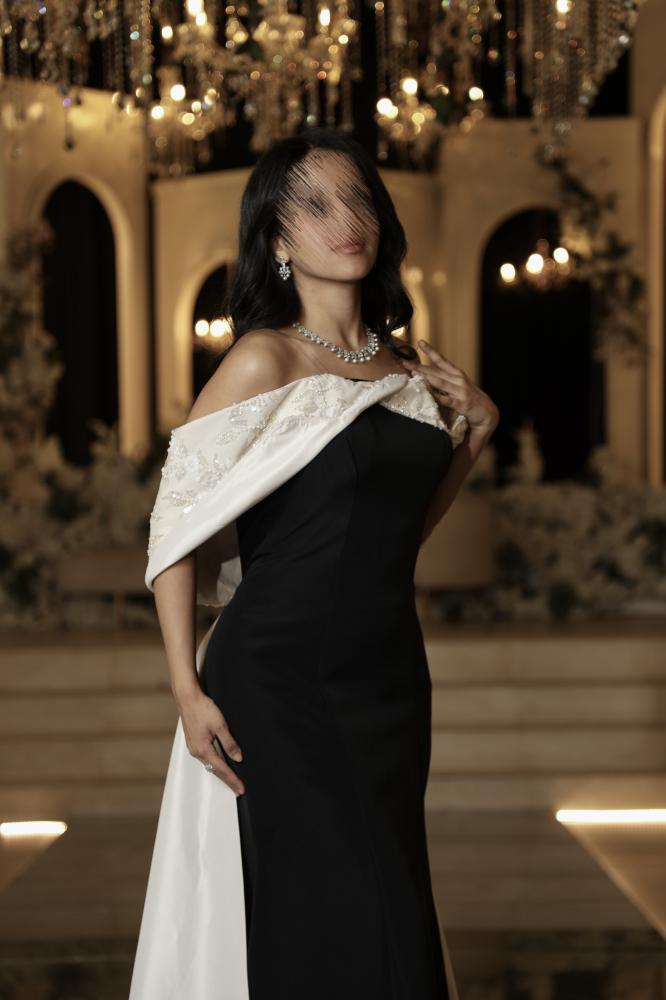 فستان سهرة اسود بتصميم أنيق يجمع بين البساطة والفخامة، مصنوع من قماش فاخر ناعم يبرز القوام بانسيابية مثالية. الفستان يتميز بتفاصيل راقية مع شال أبيض أنيق منسدل على الكتف ليمنح إطلالة ملكية تلفت الأنظار في كل مناسبة. تصميمه الكلاسيكي باللونين الأسود والأبيض يجمع بين العصرية والرقي ليكون خيارًا مثاليًا للسهرات الخاصة والمناسبات الراقية.