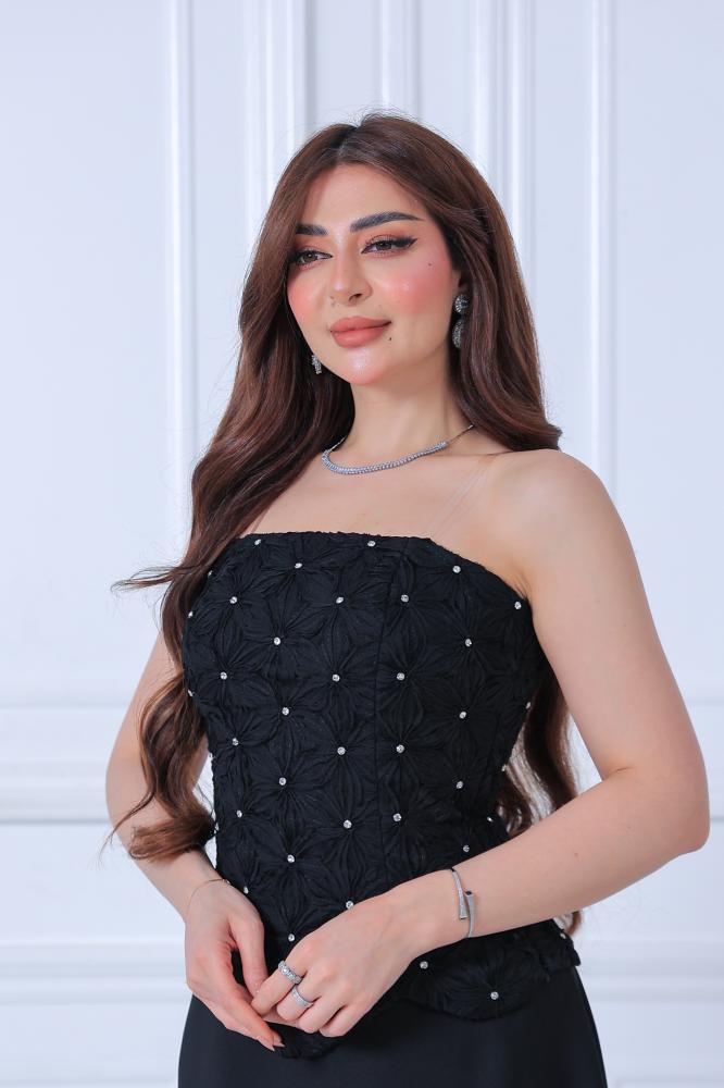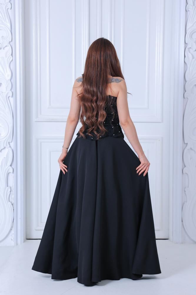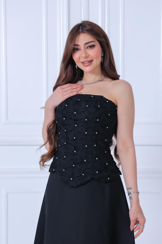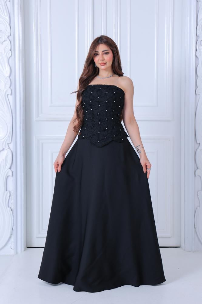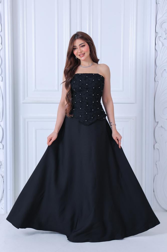 فستان سهرة طويل اسود الكلاسيكي، يتميز بتصميم بدون أكمام مع كورسيه مطرّز بتفاصيل ناعمة وزخارف بارزة مزينة بحبيبات لؤلؤ صغيرة تضيف لمسة فخمة على الجزء العلوي. التنورة واسعة ومنسدلة بسلاسة، ما يمنح الفستان إطلالة راقية وانسيابية. خيار مثالي للسهرات الرسمية ومحبات الأناقة البسيطة ذات الطابع الملكي.