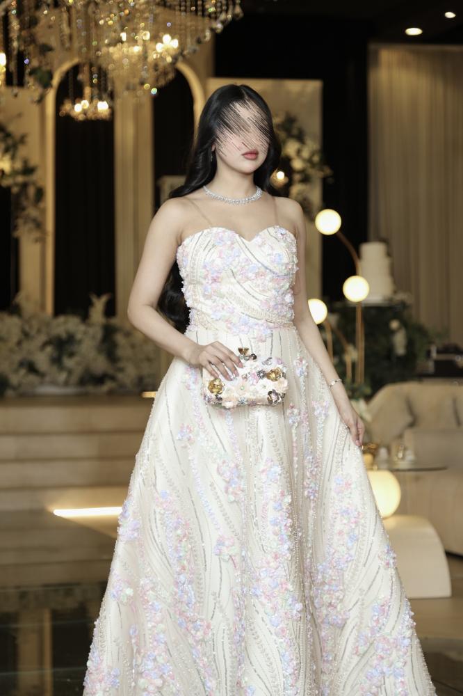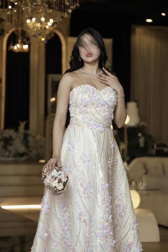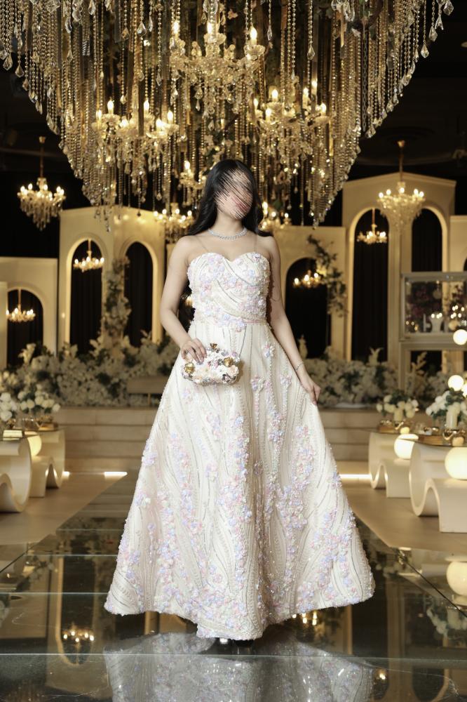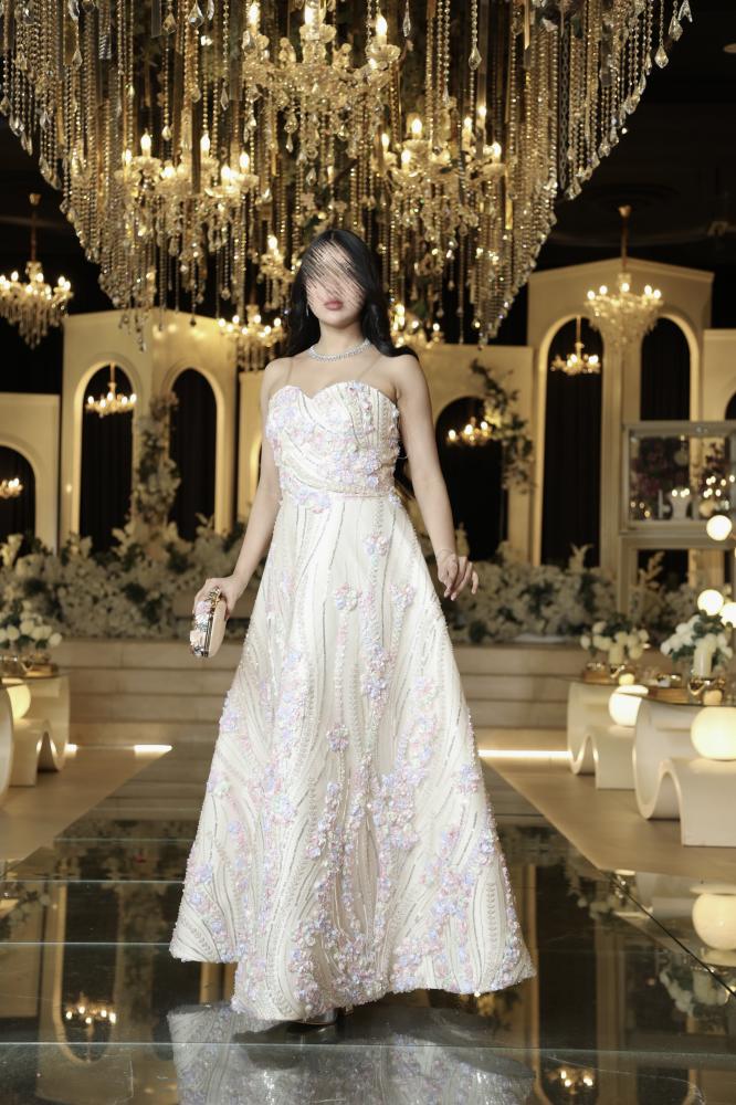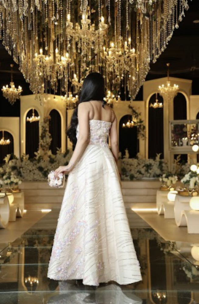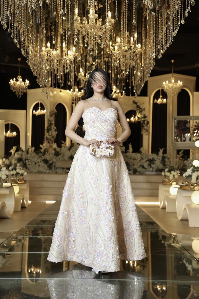 فستان سهرة عاجي فاتح بتصميم ملكي راقٍ يعكس الأناقة الكلاسيكية والفخامة العصرية. يتميز الفستان بخامة ناعمة فاخرة مزينة بتفاصيل براقة وخطوط تطريز دقيقة تمنحك إطلالة أنثوية ساحرة. التصميم بدون أكمام مع صدرية على شكل قلب يمنح الفستان لمسة رومانسية جذابة، فيما تأتي التنورة الواسعة بانسيابية رائعة لتضفي لمسة من الفخامة والرقي في المناسبات الخاصة. هذا الفستان خيار مثالي لحفلات الزفاف، الخطوبة أو السهرات الفاخرة.