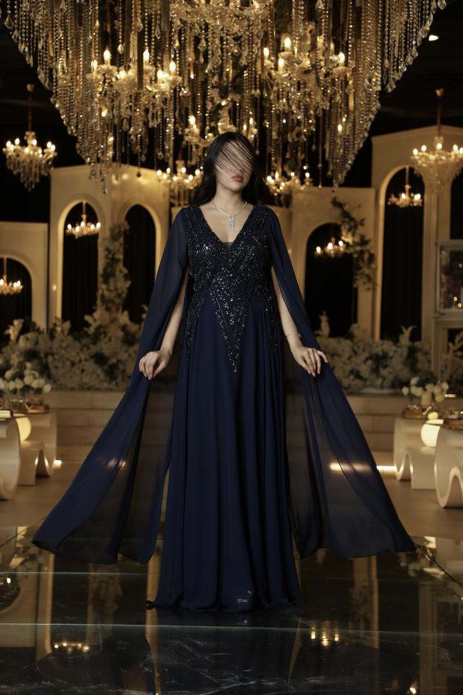 فستان سواريه كحلى يجمع بين الفخامة والرقي، مصنوع من قماش شيفون فاخر يتميز بملمسه الناعم وانسيابيته الرقيقة التي تمنحك إطلالة راقية تخطف الأنظار.